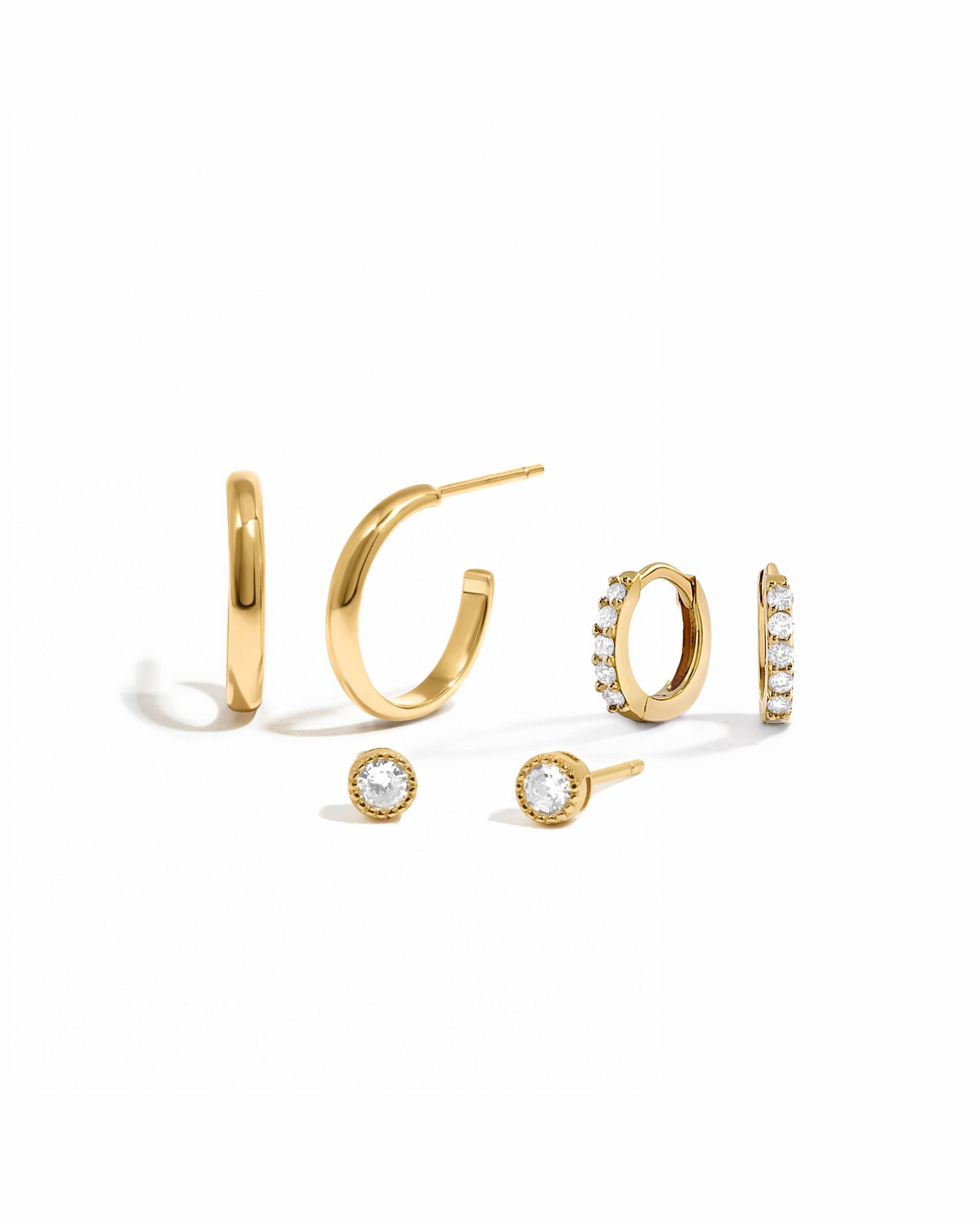 This stack includes three staple earrings that make mixing, matching, and layering simple. The Aria Hoops bring a bold touch, the CZ Huggies add refined sparkle, and the Dainty CZ Studs tie everything together for a balanced, chic look. Ideal for daily wear, events, or as a meaningful gift for jewelry lovers.