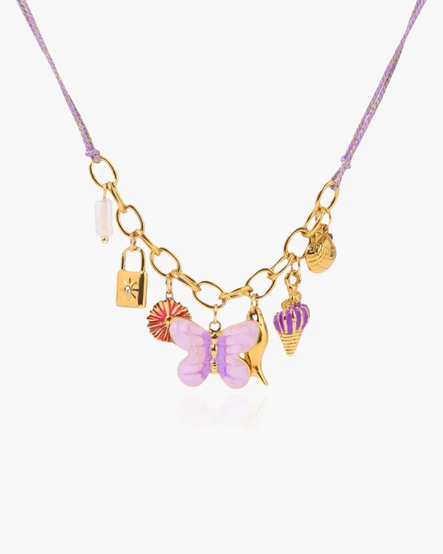 Design: Handcrafted summer-inspired cord necklace featuring playful charms — including a purple butterfly, shells, fish, and flower — symbolizing joy, freedom, and sunshine energy