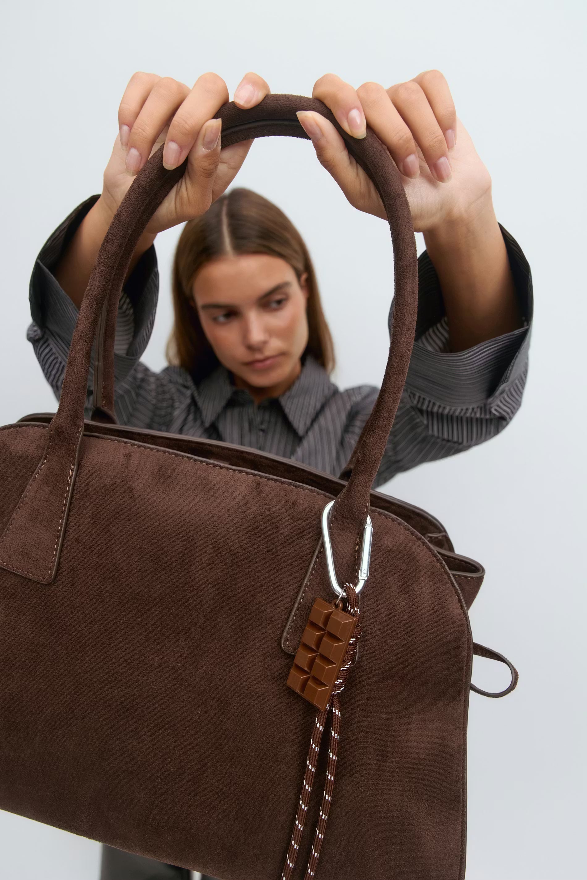 Design: Slim chocolate-bar bag charm featuring a twisted strap detail — cute, trendy, and perfect for adding personality to any bag or keychain